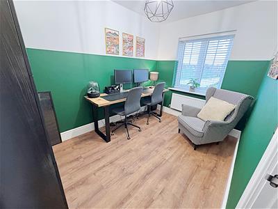 With a range of pale grey wall and base units, contrasting quartz work surfaces and up stands incorporating a stainless steel sink unit with a chrome mixer tap. An integrated electric oven, a gas hob with a stainless steel extractor fan above, an integrated fridge/freezer, dishwasher and wine fridge. Two u.PVC double glazed windows, u.PVC double glazed French doors, a central heating radiator, luxury vinyl tiles to the floor and spotlights to the ceiling.STUDY 3.38m x 2.29m (11ft 1in x 7ft 6in)