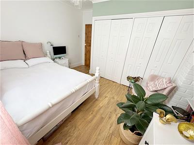 The fourth double bedroom with a u.PVC double glazed window, built in wardrobes with sliding mirrored doors, a central heating radiator, oak effect laminate to the floor, a light and coving to the ceiling.