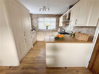 With a range of wall and base units, contrasting work surfaces incorporating a white sink unit with a chrome mixer tap. An integrated fridge/freezer, a 5 ring gas and electric range cooker with a stainless steel extractor fan above. Two u.PVC double glazed windows, tiled walls, oak effect laminate to the floor and a light to the ceiling.