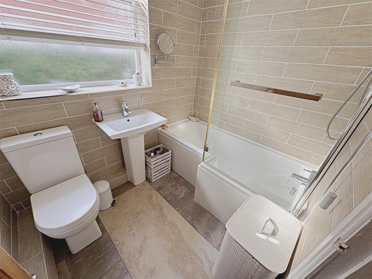 The bathroom with a white suite comprising of a P-Shaped bath, a chrome mixer tap, a plumbed shower and a glass shower screen, a pedestal wash hand basin, chrome mixer tap and a toilet. A u.PVC double glazed window, fully tiled walls and floor, a central heating radiator and a light to the ceiling.OUTSIDE