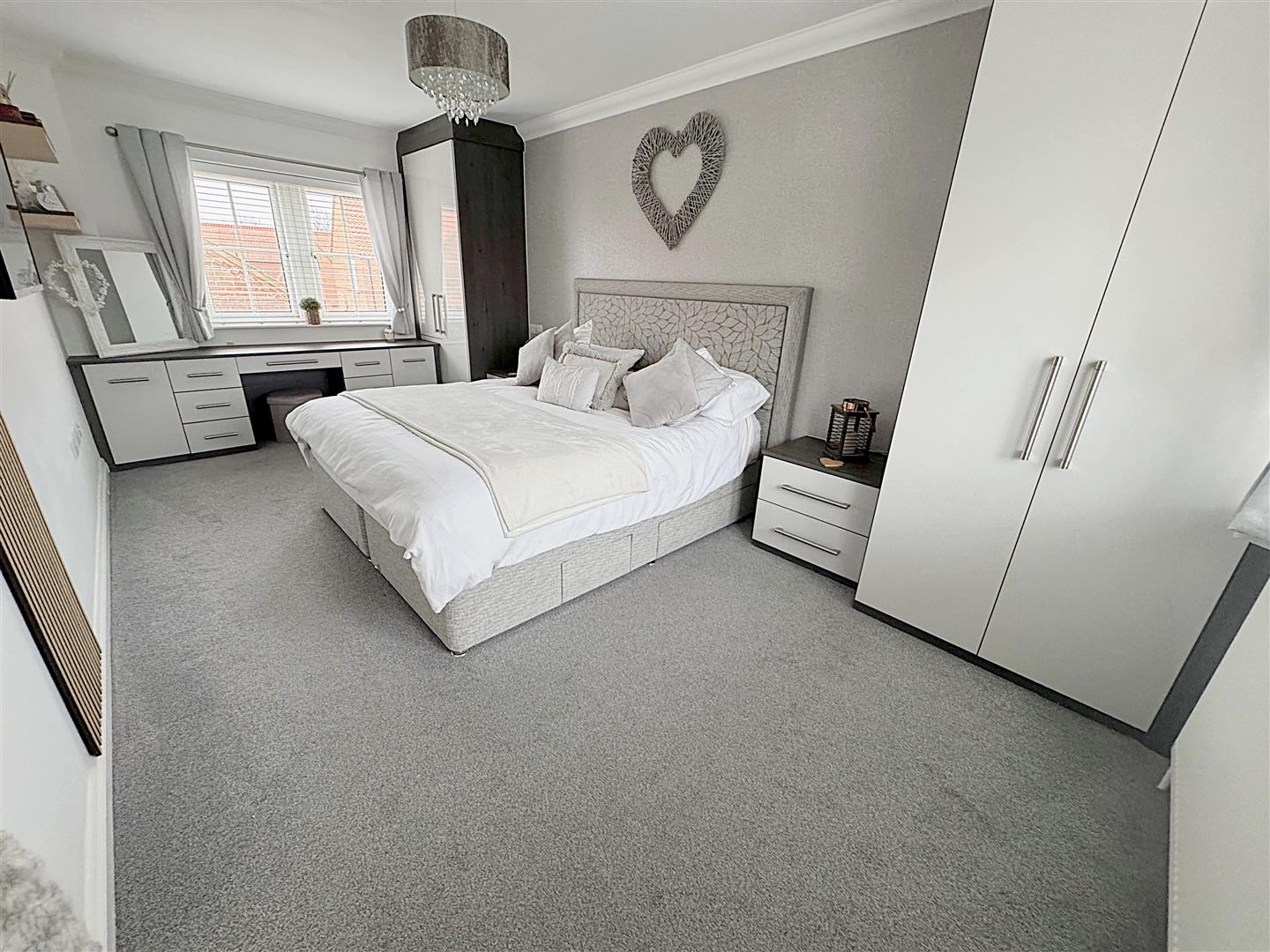 A beautifully presented second double bedroom featuring a uPVC double-glazed window, a comprehensive range of fitted wardrobes, a matching dressing table and chest of drawers. The room is finished with a central heating radiator, ceiling coving, and a modern light fitting.