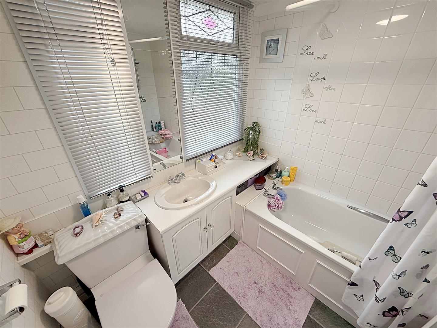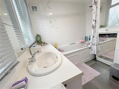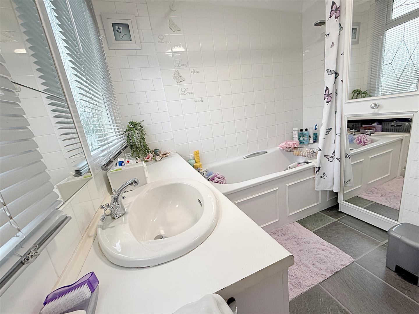 This is a dual aspect kitchen with a uPVC double glazed window to the side and rear elevations, a double glazed back door leading to the garden. The fitted kitchen comprises of cream base and wall units with a marble effect roll top worktop, a stainless steel sink and drainer with mixer tap, a gas oven with gas hob, fridge freezer & washing machine, a central heating radiator and a central light fitting.BATHROOM 2.34m x 2.26m (7ft 8in x 7ft 5in)