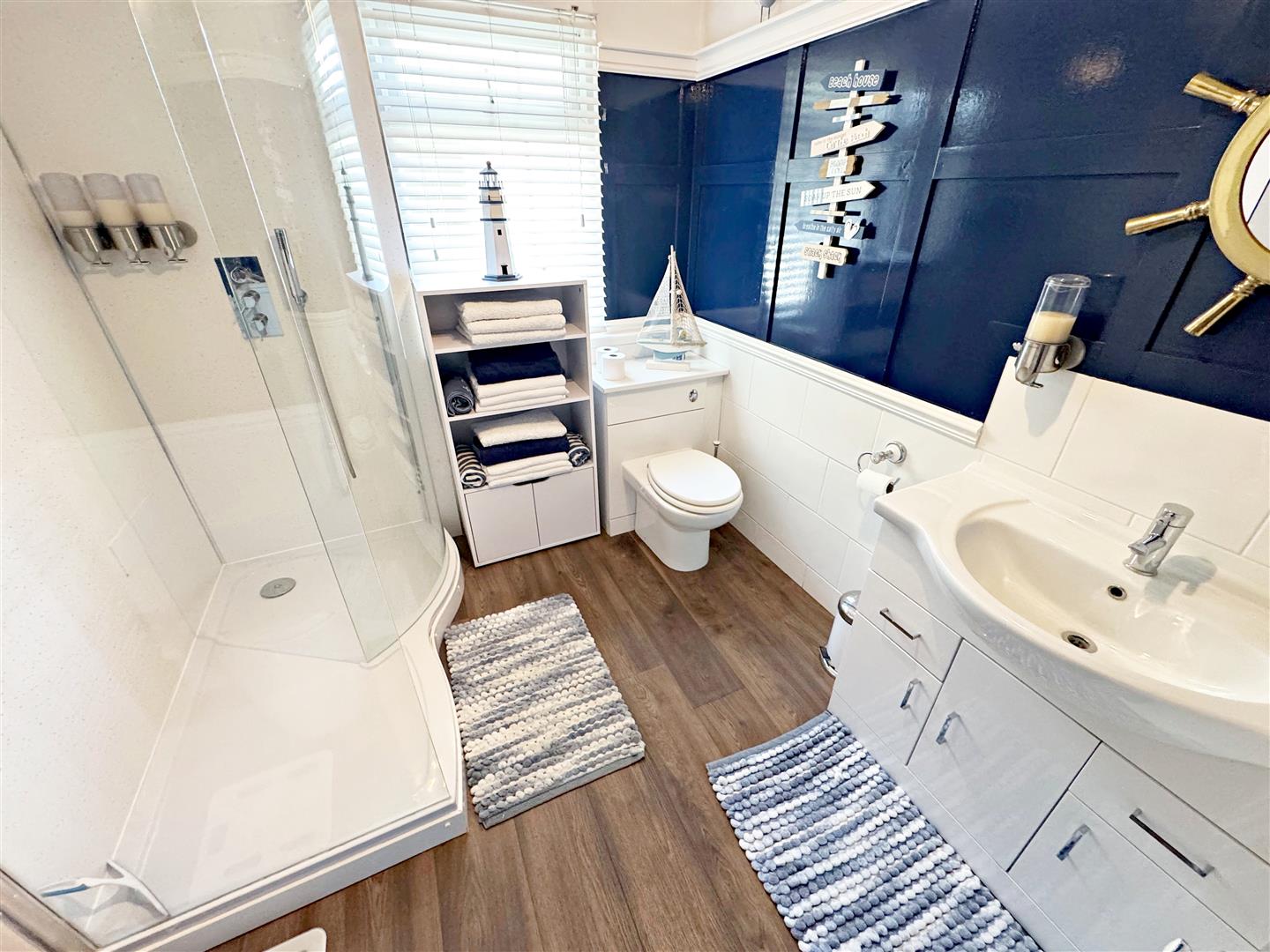 The bathroom comprising of a large shower with a rainfall head, a vanity sink unit, a chrome mixer tap and a cabinetised toilet. A u.PVC double glazed window, the walls are part tiled and part shower boarded, a chrome ladder style radiator, vinyl to the floor and a light to the ceiling.OUTSIDE