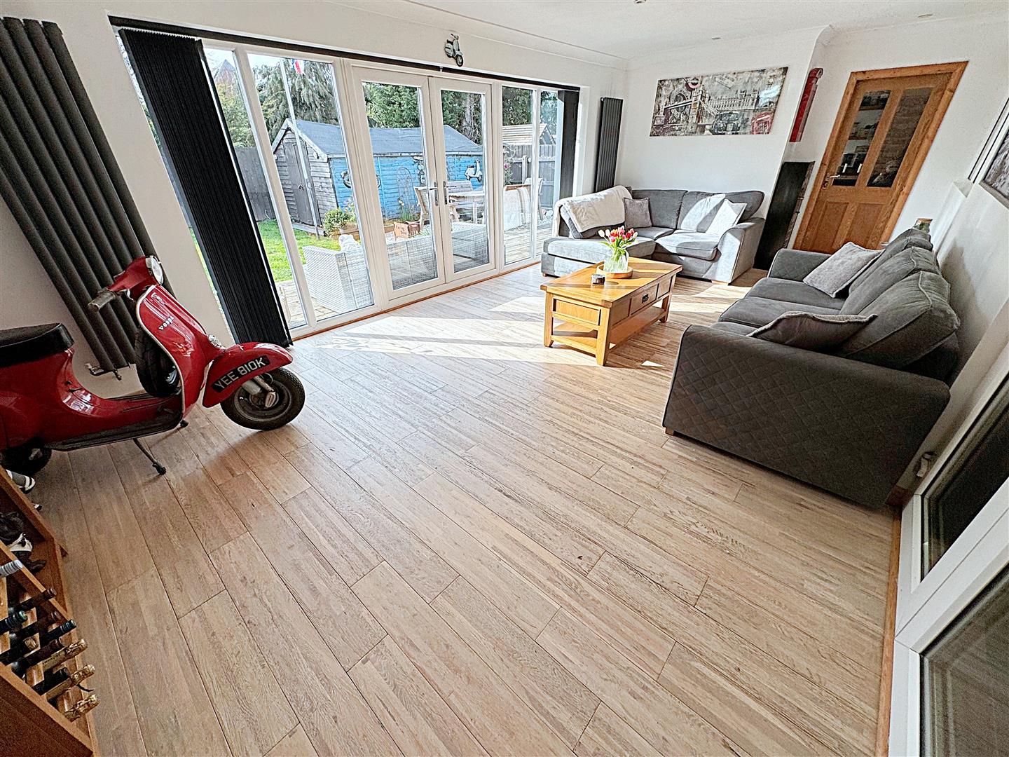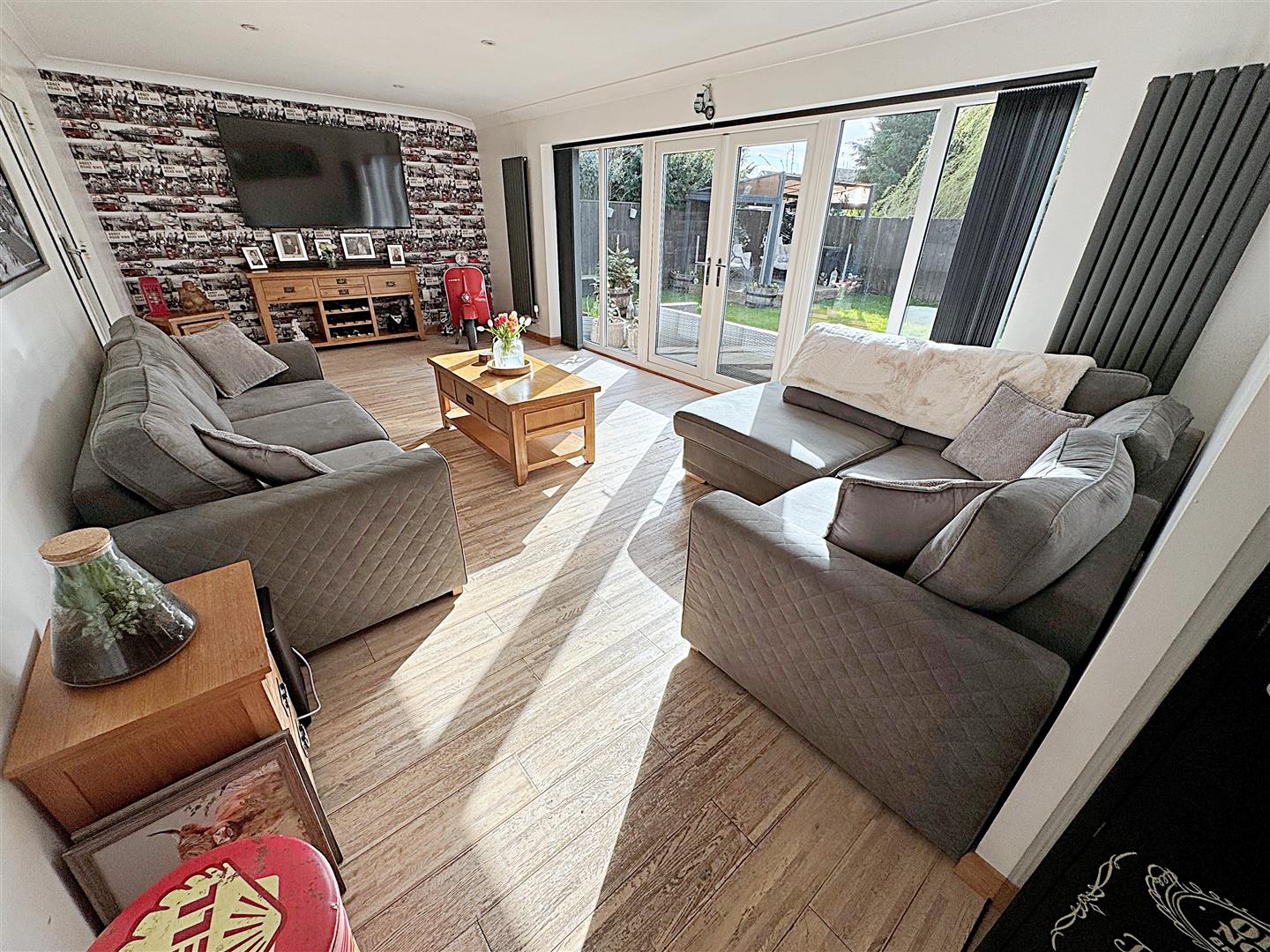 The great size orangery with u.PVC double glazed windows and French doors, two graphite vertical radiators, solid wood flooring, spotlights and coving to the ceiling.