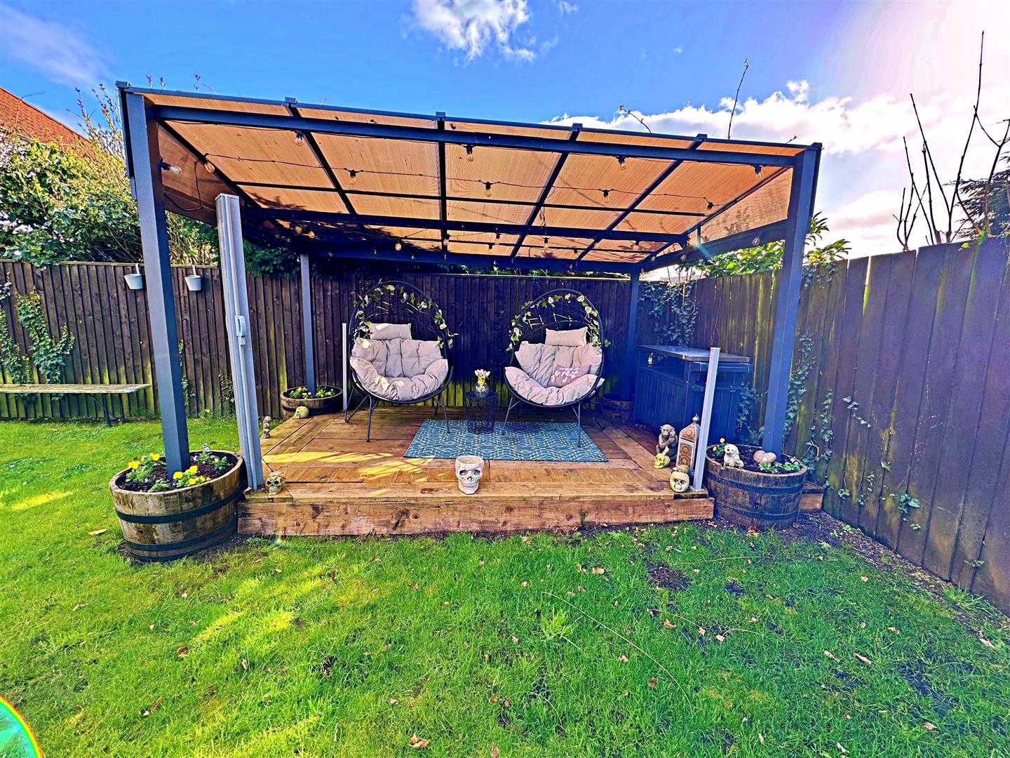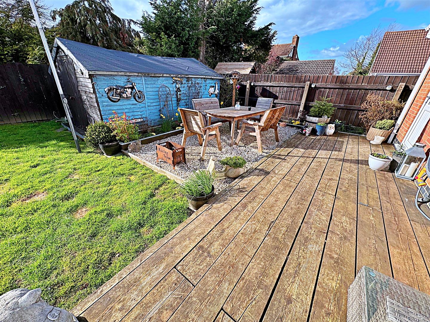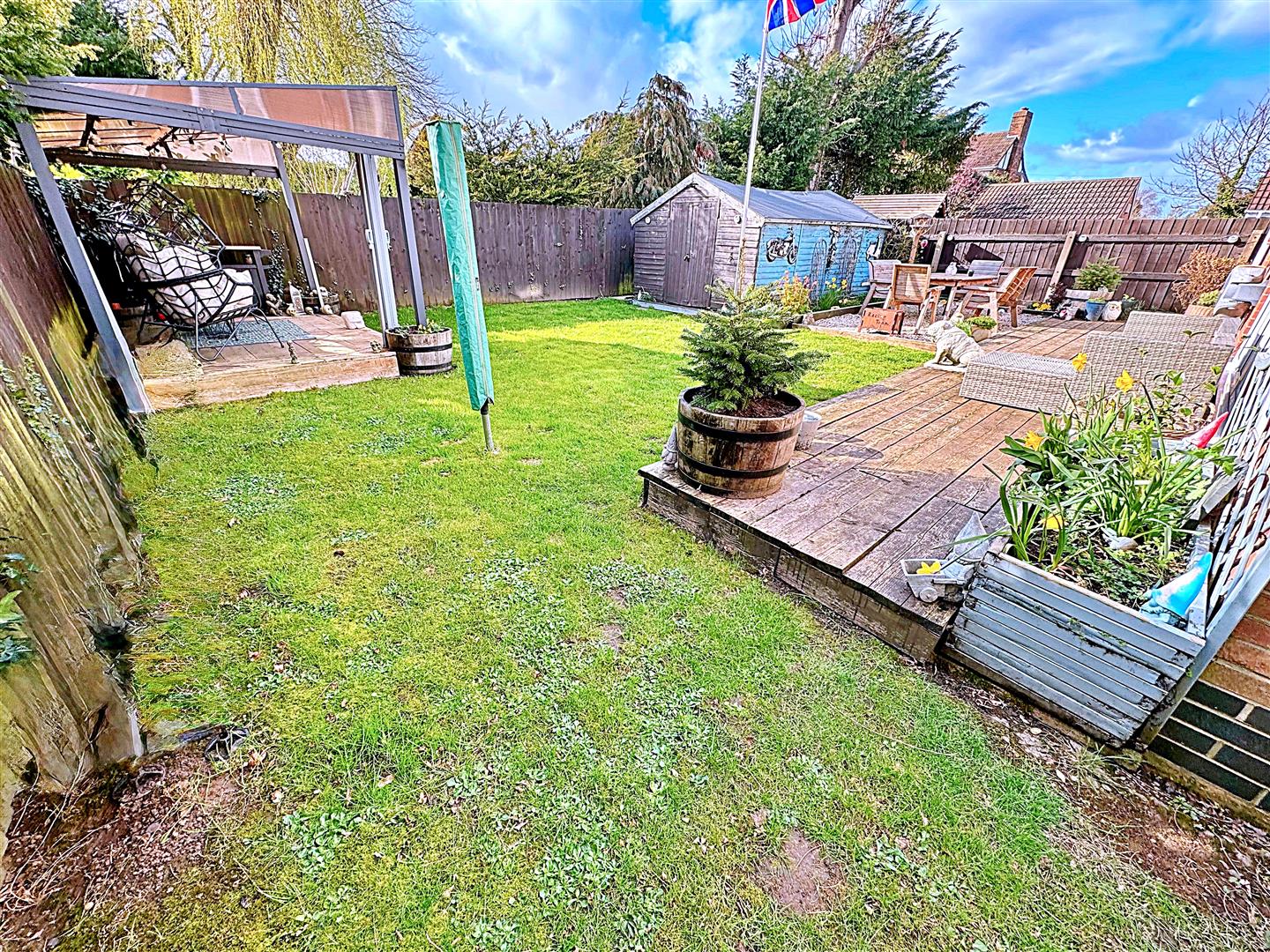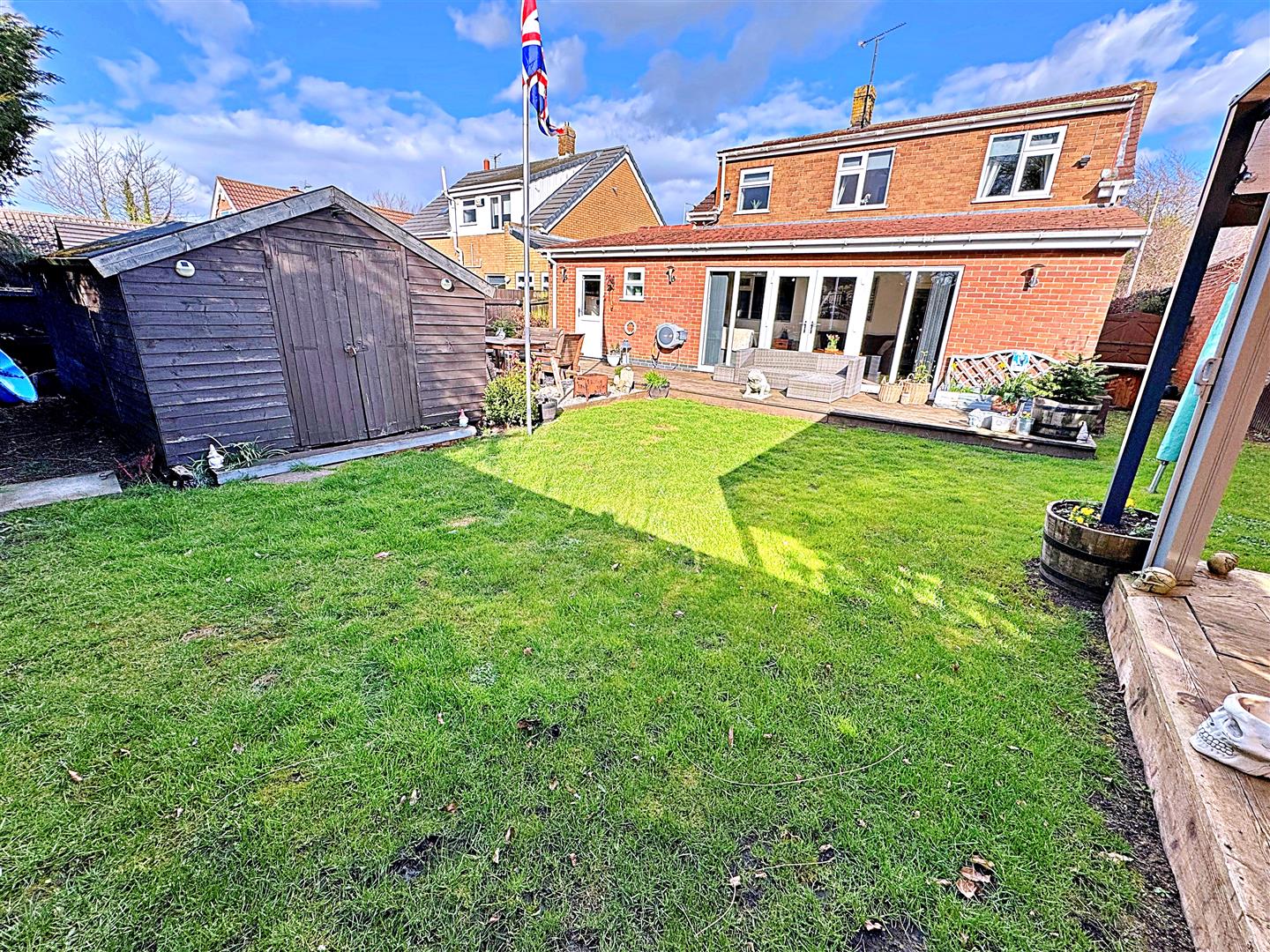 The front garden features a charming walled and hedged boundary, with two driveways flanking a central lawned area. A wooden gate provides access to the rear garden, which is fully enclosed with fencing and laid mainly to lawn. It also offers a raised decked patio, a decorative stone patio, and an additional raised decked area leading directly from the orangery. A large timber shed provides excellent storage.