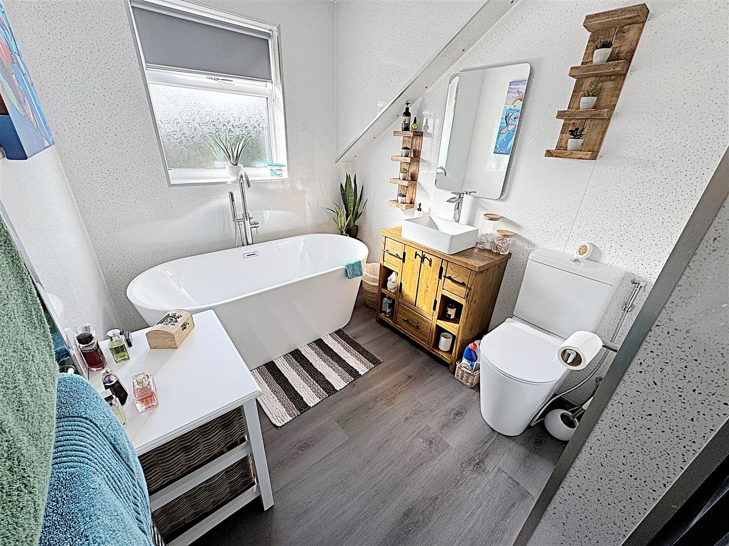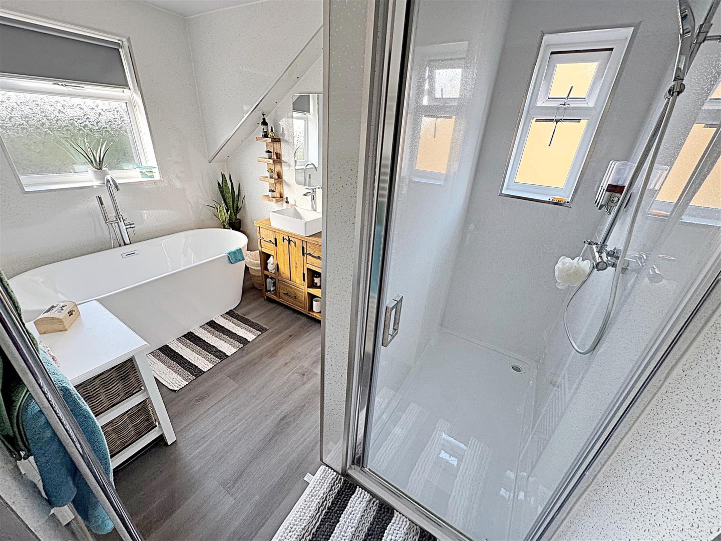 The bathroom with a white suite comprising of a freestanding bath with a freestanding chrome mixer shower tap, a vanity sink unit with a chrome mixer tap, a toilet and a walk-in shower enclosure. Two u.PVC double glazed windows, PVC boarding to the walls and ceiling, two chrome ladder style radiators, Luxury vinyl tiles to the floor, spotlights and loft access to the ceiling.