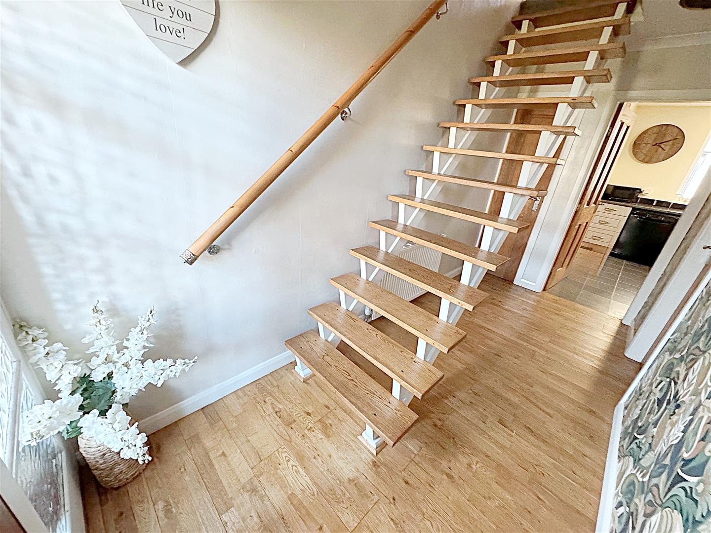 With a solid oak floor and staircase, a storage cupboard, a central heating radiator and a light to the ceiling.