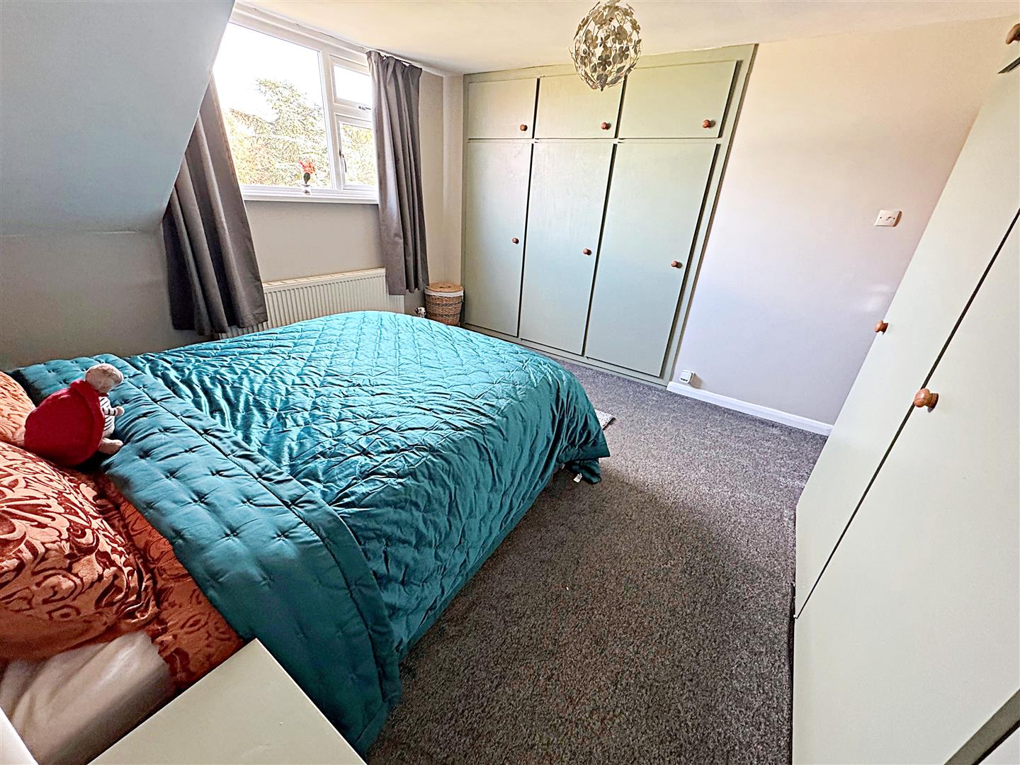 This double bedroom with a u.PVC double glazed window, a range of built in wardrobes, a central heating radiator, a light and coving to the ceiling.