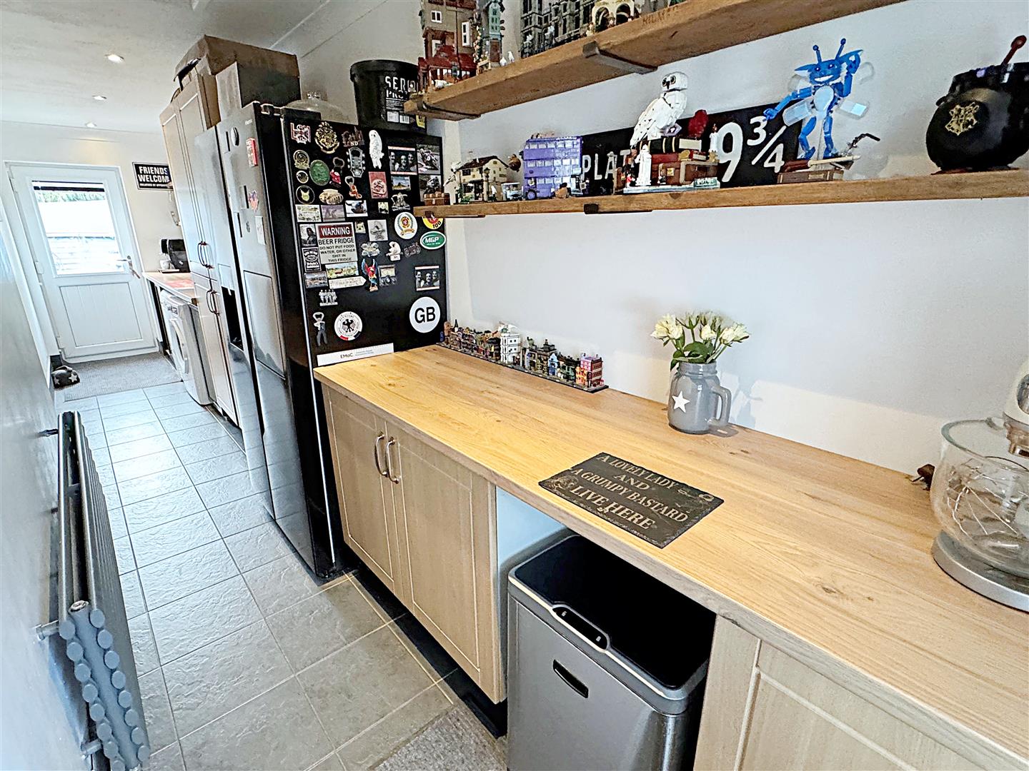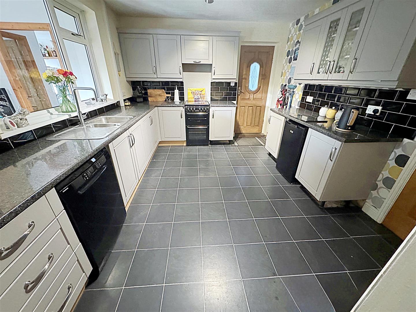 With a range of grey painted wall and base units, contrasting work surfaces and tiled reveals, a stainless steel sink unit with a chrome mixer tap. Space for a cooker with a housed extractor fan above, plumbing for a dishwasher and space for an under counter fridge. A u.PVC double glazed window, a central heating radiator, laminate to the floor and a light to the ceiling.