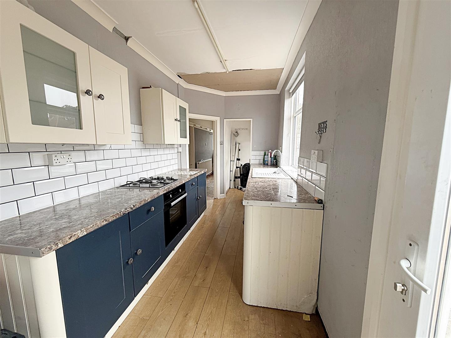 The kitchen is situated to the rear of the property and features a pantry with uPVC window to the side elevation, boiler and plumbing for a washing machine. The main kitchen comprises of a marble effect roll top work surface and cream upper units with a contrasting navy to the bottom with built in electric cooker, gas hob and a built in dishwasher. There is a cream sink and drainer with a chrome mixer tap, a central heating radiator, uPVC window to the side elevation and uPVC and glass back door to the the side elevation.CLOAKROOM 2.08m x 0.86m (6ft 1 x 2ft 1)