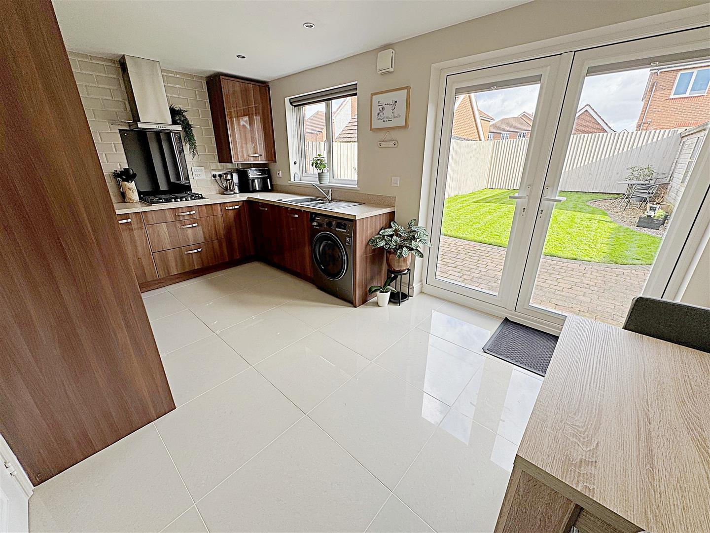 With a range of dark wood effect wall and base units, contrasting work surfaces and upstands, a stainless steel sink unit with a chrome mixer tap. A gas hob with a stainless steel extractor fan above, an integrated fridge/freezer, a dishwasher, a housed electric oven and duo microwave. A u.PVC double glazed window and French doors, a central heating radiator a tiled floor and spotlights to the ceiling.