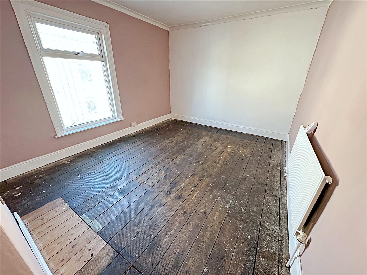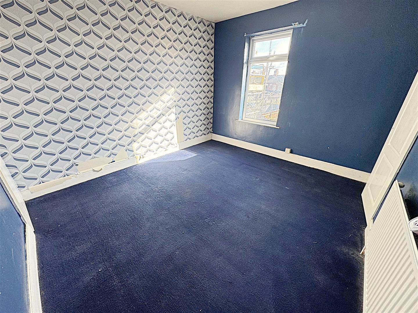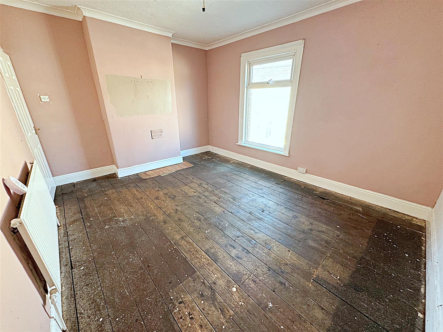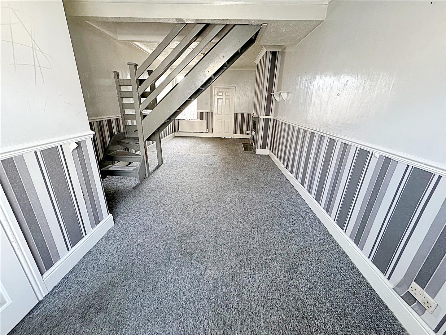 With dual aspect u.PVC double glazed window, a grey painted fire surround with a marble effect back and hearth. Two central heating radiators, stairs to the first floor accommodation, two lights and coving to the ceiling.
