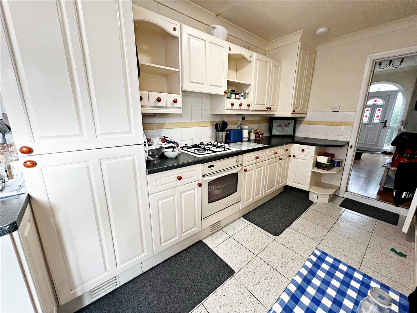 The kitchen with a range of wall and base units with contrasting work surfaces and tiled reveals, a stainless steel sink unit with a chrome mixer tap. An integrated electric oven, gas hob and fridge/freezer. There is plumbing for a washing machine and the central heating boiler is housed within a cupboard. Two u.PVC double glazed windows and a u.PVC double glazed door, a central heating radiator, a tiled floor, a light and coving to the ceiling.
