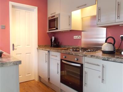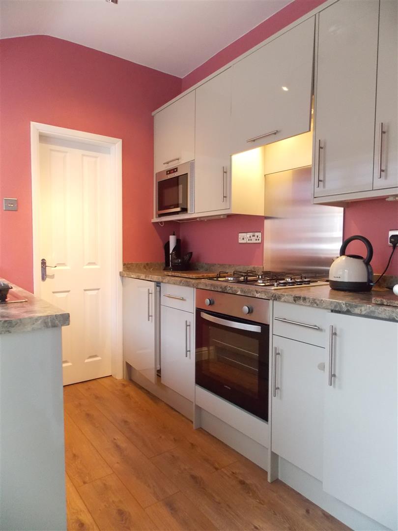 The lovely sitting room to the rear of the property with a u.PVC double glazed window. It has fitted blinds to the window, it is newly and beautifully decorated and also v-grooved laminate to the floor, central heating radiator, understairs cupboard and fretwork cupboard with extra cupboard below.KITCHEN 2.77m x 2.10m (9ft 1in x 6ft 11in)