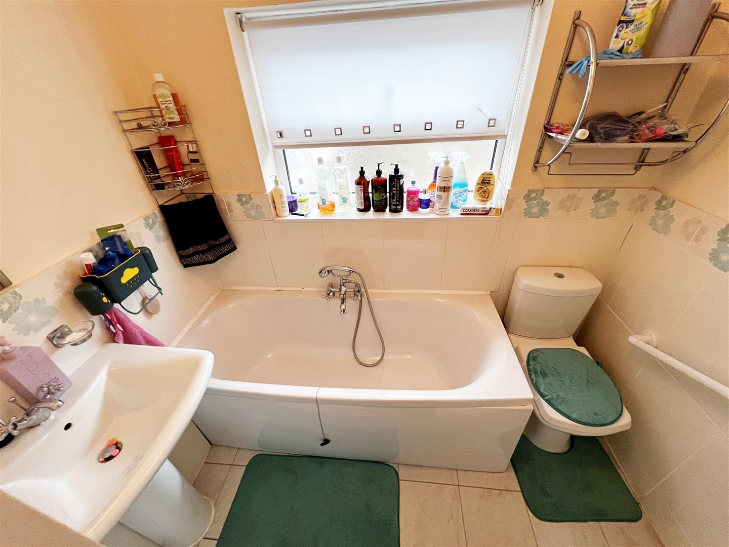 The bathroom with a white suite comprising of a paneled bath, a pedestal wash hand basin and a WC all with chrome fittings. There is a u.PVC double glazed window, part tiled walls, a tiled floor, a white ladder style central heating radiator and a light to the ceiling.