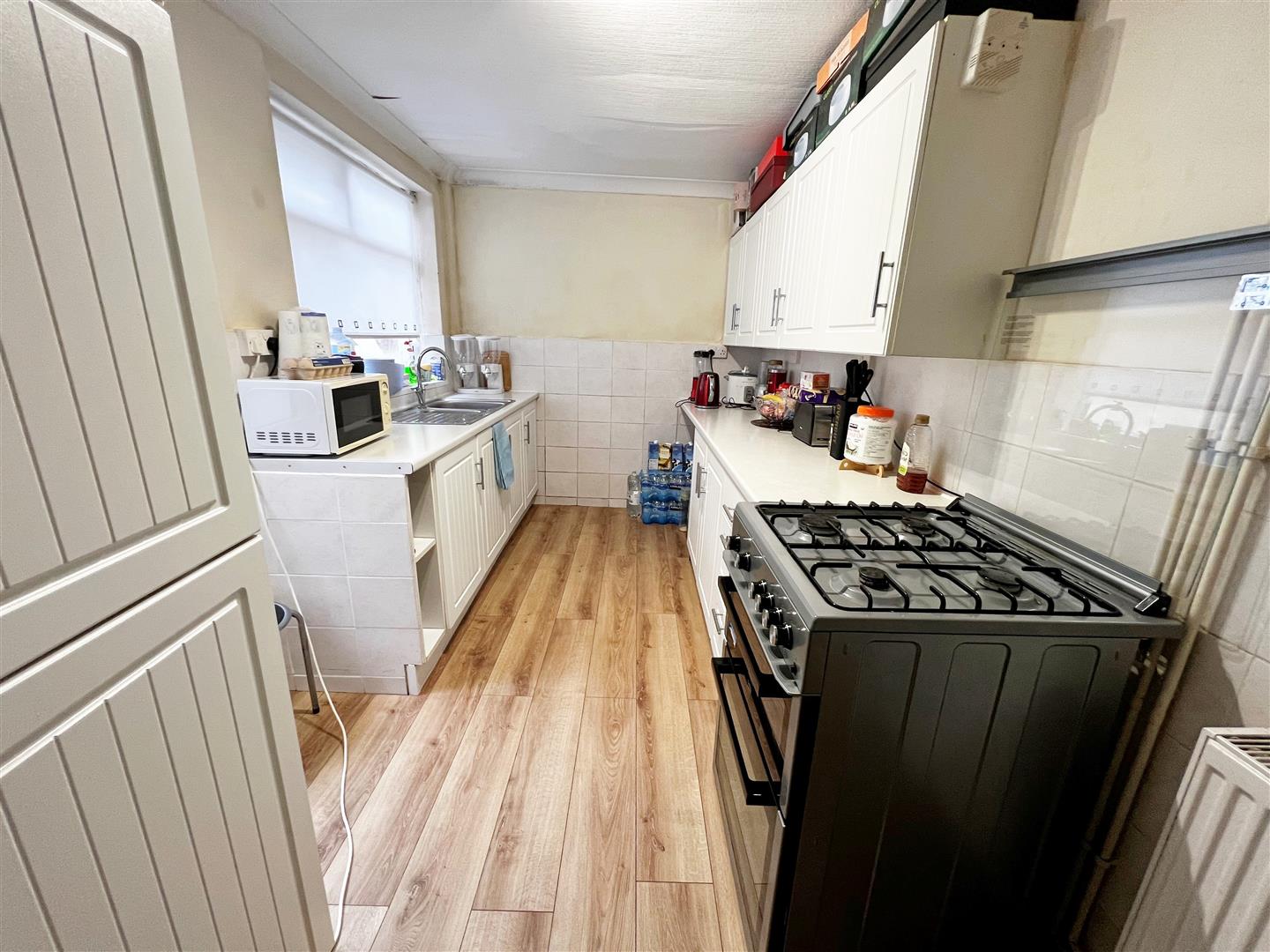 With u.PVC double glazed French doors, laminate to the floor, a central heating radiator, under stairs storage area, a light and coving to the ceiling.KITCHEN 4.24m x 2.26m (13ft 11in x 7ft 5in)